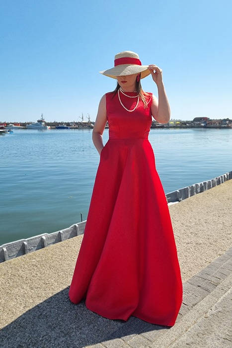 Realizată din tafta cu organza diafană, rochia are o croială clasică, cu buzunare ascunse și cordon detașabil, gândită pentru confort, libertate de mișcare și prezență impecabilă. Linia este curată, echilibrată, lasând materialul și proporțiile să creeze impactul vizual.
